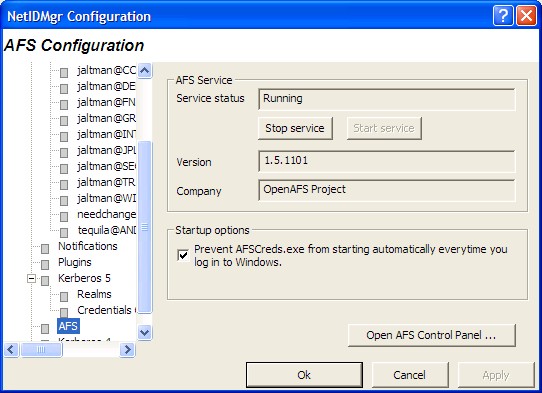 As of release 1.5.9, OpenAFS for Windows includes a Network Identity Manager Provider for obtaining AFS tokens. This plug-in is a contribution from Secure Endpoints Inc. Network Identity Manager is a multiple identity credential management tool that ships with MIT Kerberos for Windows version 3.0 and above. The OpenAFS plug-in requires Heimdal or MIT Kerberos for Windows version 3.1 or above.